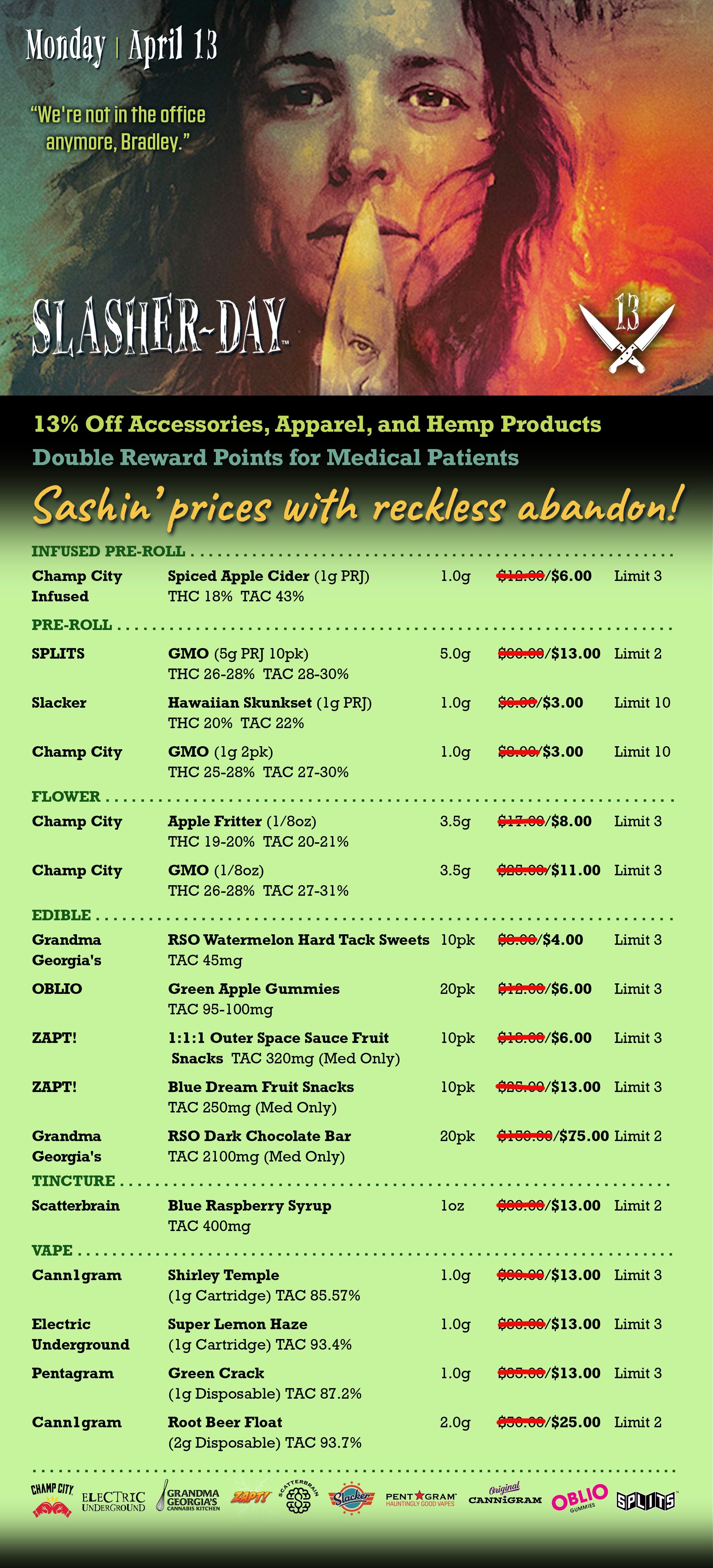 We love a good horror movie, don’t you? On the 13th of every month we celebrate this passion by slashing prices on Pre-rolls, Flower, Edibles, Vapes, Tinctures, Apparel, and Accessories.